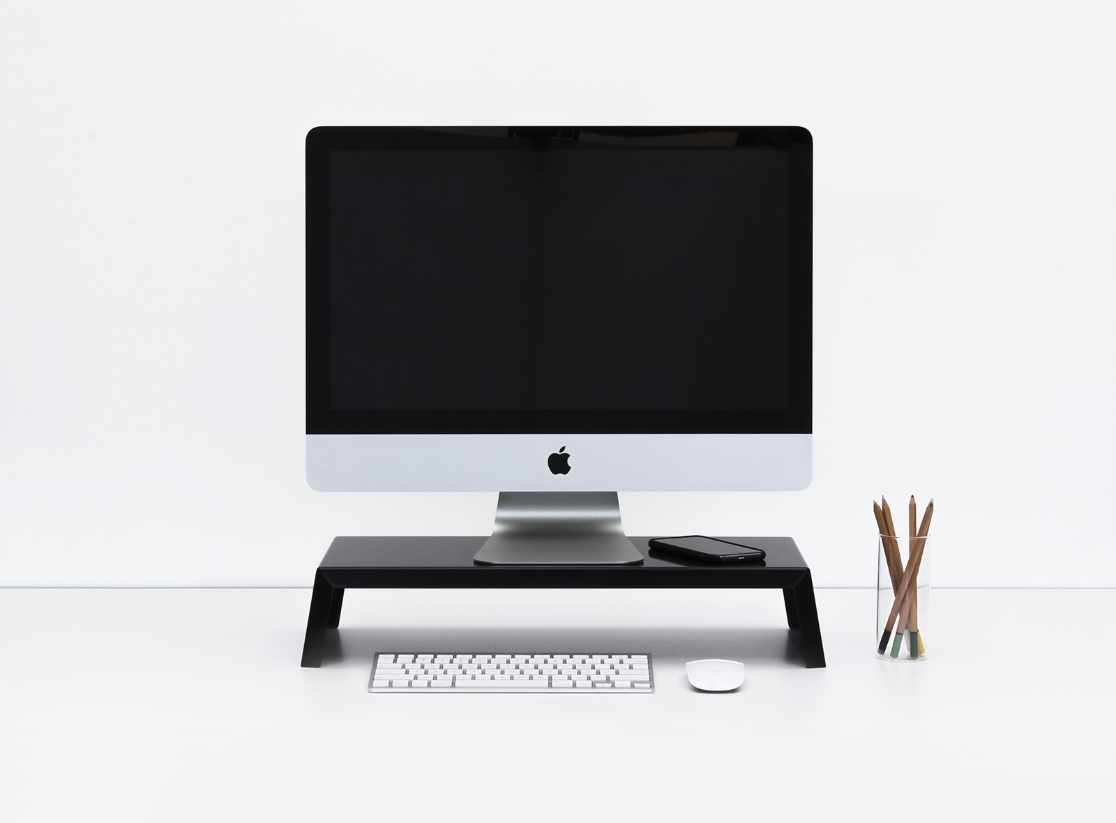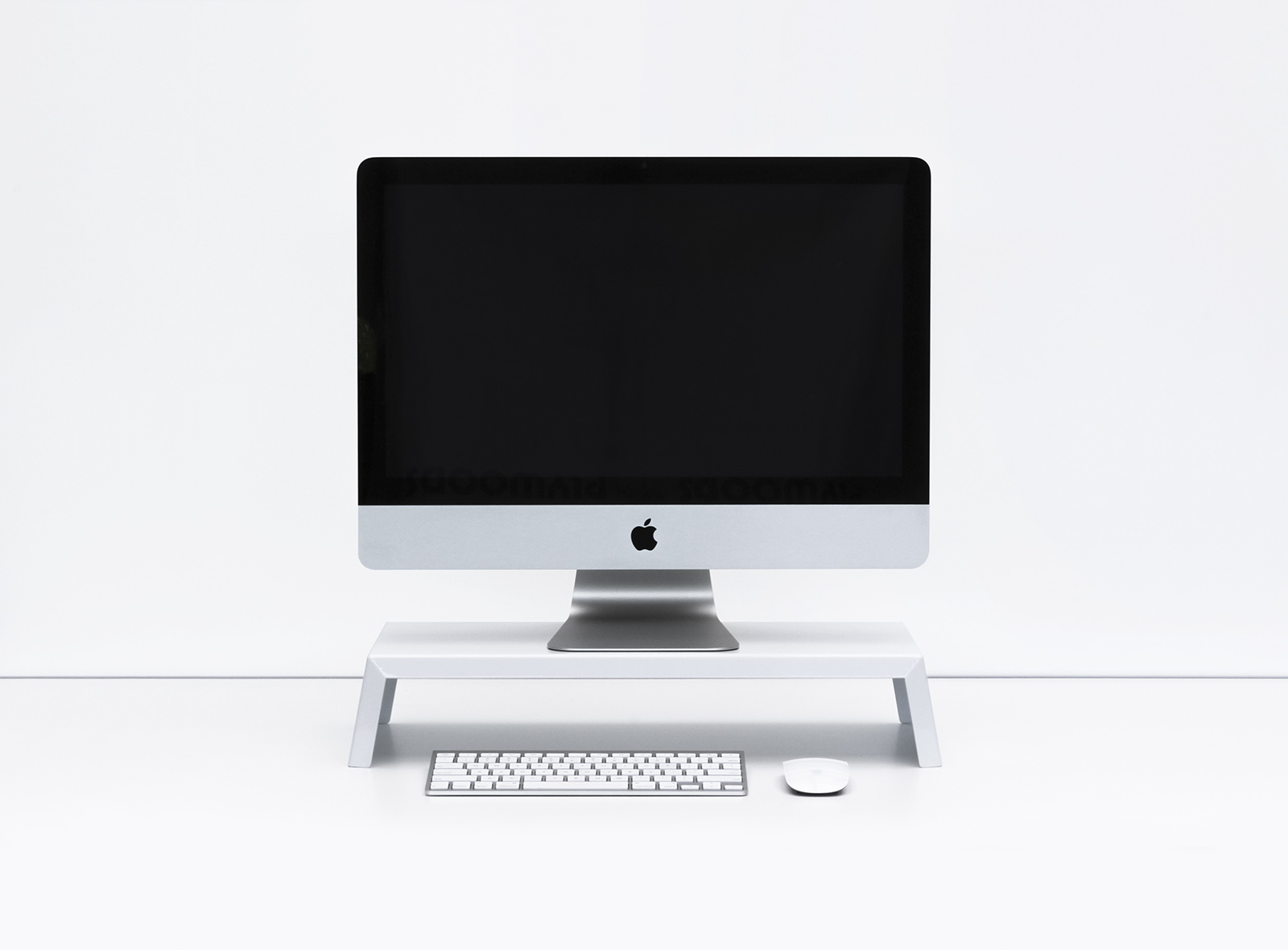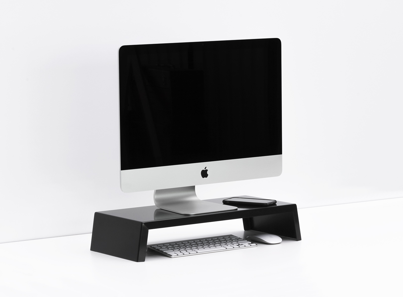 Standard height is 100mm – though we can custom make a stand to your specific height if needed. Suitable for all types of monitors (21.5inch iMac pictured).