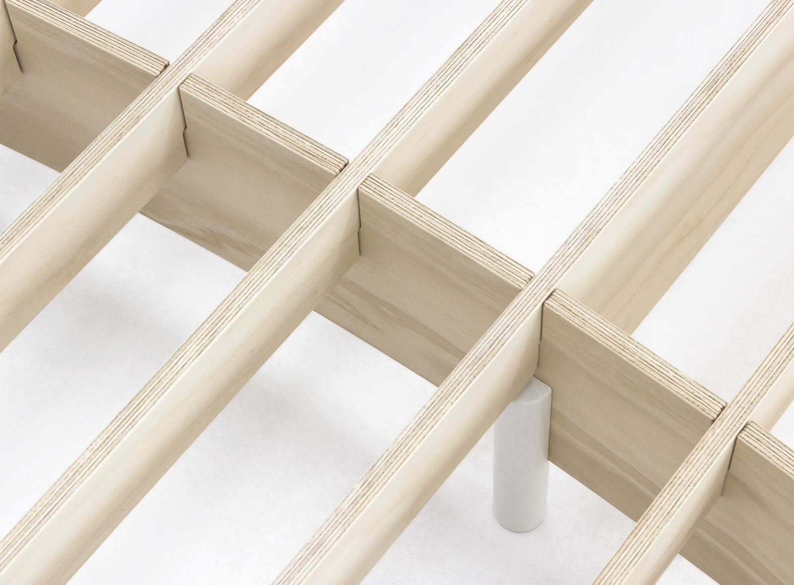 The long plywood beams provide constant tension and increase stability, so the joints won't degrade over time. It's efficiently made by CNC routing and is finished by hand.